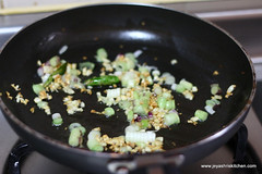 - In a pan add oil and add the chopped ginger, garlic,spring onion whites and green chilly.