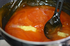 - Add 1 tblsp of ghee and stir continuously to avoid forming lumps, this will give a glossy texture and the halwa starts getting transparent.