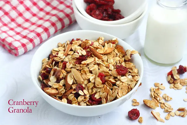 Granola i generally buy from supermarket. When Suresh completed his full marathon last week i though i will make something super healthy for him at home. I have a big box of Rolled Oats lying down in the kitchen shelf , which i bought for making my Oats Tikki . I bought apricots, almonds,cranberry in bulk as he started preparing for the marathon. So tried this Cranberry granola at home and it turned out super yummy and i have stopped buying Granola from super market now a days. Try this super easy recipe and enjoy your breakfast.