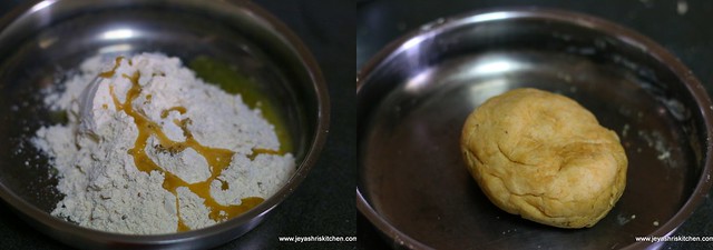 - In a bowl add atta, ghee, ajwain and salt. Mix well and add water little by little to make it a stiff dough.