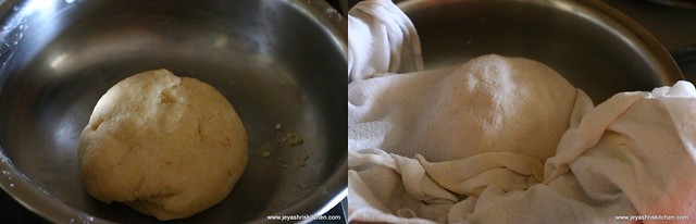 - Leave it for 5 minutes. Slowly sprinkle water and make it into a smooth stiff dough. Cover this with a damp cloth and keep it aside.