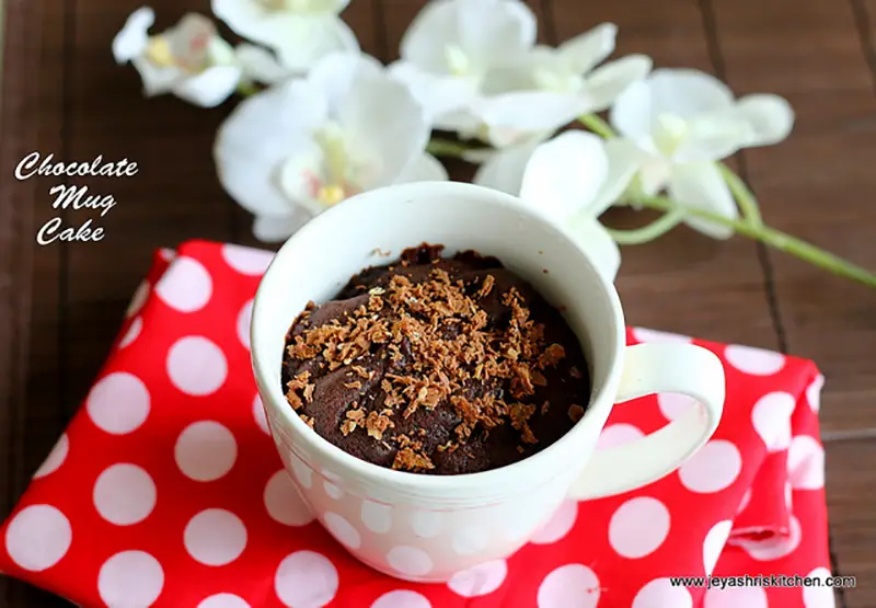 To bake a  Chocolate cake in microwave , is my long time due. I don’t have a microwave at home and so i was postponing to make this cake.   As valentines day is nearing, it thought it is the right time to post this eggless chocolate mug cake in microwave.  I baked this cake in my friend’s place and it took exactly 2 minutes for me to bake this cake. If you are craving for an chocolate cake or kids are asking for a quick snack just make this cake in just 2 minutes.The cake turned out super soft and moist. The recipe i have adapted from Here.