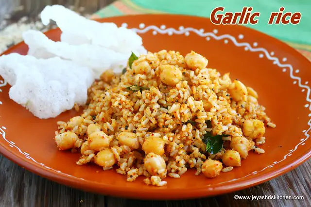 Garlic rice recipe, a very simple garlic flavored rice made using Brown Sona masoori rice, healthy lunch box recipes.