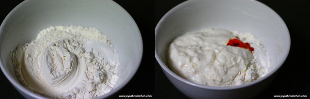- In a bowl add the maida, rice flour, baking powder and sieve it.