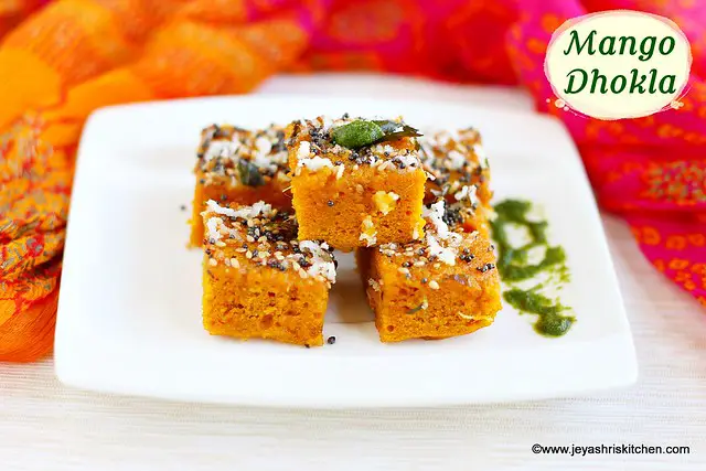 Mango dhokla recipe, Gujarati khaman dhokla made using fresh mango puree. These mango dhoklas tasted so yummy. When I saw mango dhokla on Instagram, I was too fascinated by it as I am a big fan of both mango and dhokla. At the same time, I was a bit skeptical as to how it would taste. So I tried in very minimum quantities as I didn’t want to waste my precious organic Mangoes. But it turned out too good and I just kept 2 pieces for the family to try it out. I want to make this again for us during this weekend. I couldn’t stay away from gobbling it. It didn’t give any odd sweet taste. These dhoklas were too mango flavourful and at the same time gave the taste of dhoklas too. I adapted the recipe of Gujarati Khaman dhokla from Tarla Dalal’s space and replaced water with mango puree. This Mango Dhokla is a must-try recipe for this mango season.