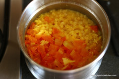 • Chop the tomato into small cubes . Wash the dal and pressure cook this with turmeric powder and grated ginger.