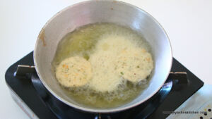 - Heat oil and when it is hot put the flattened thattais into the oil.
