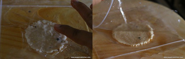 - Place another greased ziplock cover on it and place a flat-based vessel (I used a davara) on the ziplock to get even roundels.