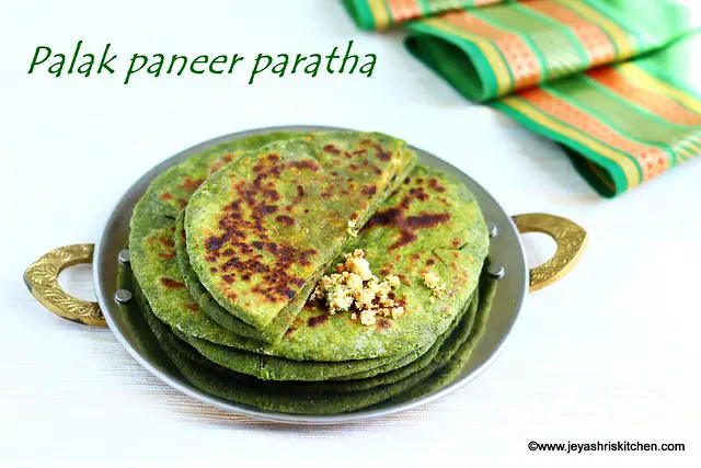 Palak paneer paratha recipe with step by step pictures, dough made using palak puree and scrambled paneer stuffed inside the paratha. Those who are reading Jeyashri’s kitchen for a long time, know my love for parathas. I love to have it any time of the day. Palak and paneer is a wonderful combo and i have posted palak paneer recipe and also palak paneer biryani recipe too. Many times i wanted to post the recipe of this palak paneer paratha, but somehow it never happened. Few days back i got a bunch of palak leaves and fresh paneer tried at home. Kids loved this palak paratha. If you are looking for some recipes with palak, then try this paratha or give and attempt to make my palak puri recipe. I made it as a no onion no garlic version. You can add onions to the paneer stuffing and add some more spices of your choice too. Do try this and let me know how it turned out.