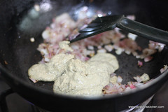 - Dry roast the black pepper, dry coconut, sesame seeds,cardamom , saunf, and cloves till the coconut turns nice brown color. Take care not to burn it. Lastly add the cashew nuts and switch of the flame. Grin this into a fine paste adding little water.
