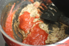 - Now add the ground masala. After few seconds add the tomato puree( if adding tomatoes, grind it nicely and add at this stage) , red chilli powder, coriander powder and salt.