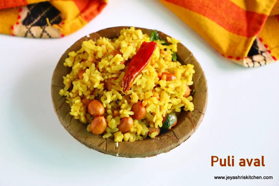 Puli aval recipe, South Indian style Tamarind Poha – No onion no garlic tiffin recipe – Easy Puli aval recipe with full video and step by step pictures.