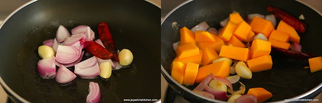 - In a pan add 1 tsp of oil and , roughly chopped onions, peeled garlic and red chili. Cook this in a medium flame for 2 minutes. Now add the pumpkin cubes. Saute for 2 minutes.
