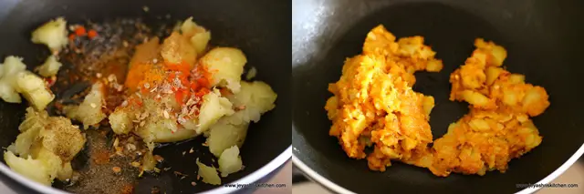 • Cook this for few minutes and mix well nicely. Switch off the flame. Samosa filling is ready.