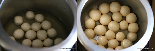 - Let the pressure subside on it own. Open the cooker and the rasgullas are done. This will increase in size mostly double. So just chose a cooker accordingly.