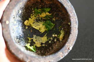 - Add oil in a pan and throw in the mustard seeds. Add the coarsely ground ginger and green chili paste and add the curry leaves to this.