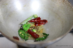 - In a pan add oil and throw in the mustard seeds , green chilli, red chilli and curry leaves.