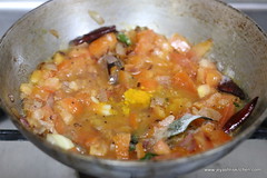 - Add the onions and saute till they turn soft. Now add in the tomatoes.