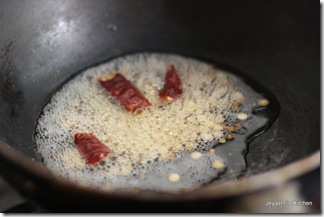 - In a pan add sesame oil and add the mustard seeds, toor dal vendayam(fenugreek seeds) and when the mustard crackles add the red chillies.